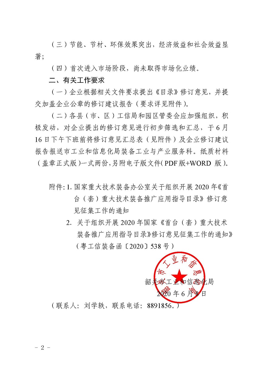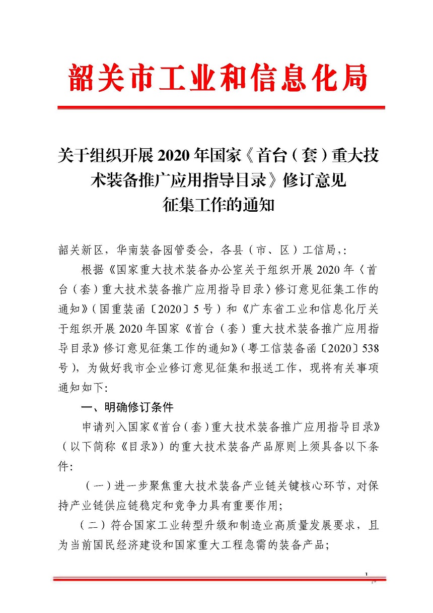 韶關(guān)新區(qū)各企業(yè):現(xiàn)將《關(guān)于組織開展2020年國(guó)家《首臺(tái)(套)重大技術(shù)裝備推廣應(yīng)用指導(dǎo)目錄》修訂意見征集工作的通知》轉(zhuǎn)發(fā)給你們,如有修訂意見,請(qǐng)按照通知要求于6月15日將修訂意見和修訂建議報(bào)告報(bào)送至韶關(guān)新區(qū)經(jīng)濟(jì)促進(jìn)局711辦公室(聯(lián)系人:聶東勝8280506)