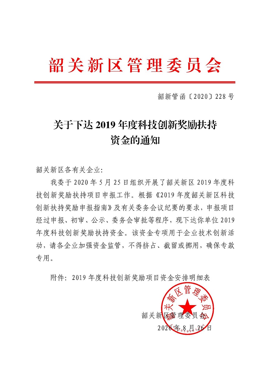 附件:韶關(guān)新區(qū)2019年度科技創(chuàng)新扶持獎(jiǎng)勵(lì)資金安排明細(xì)表.xls