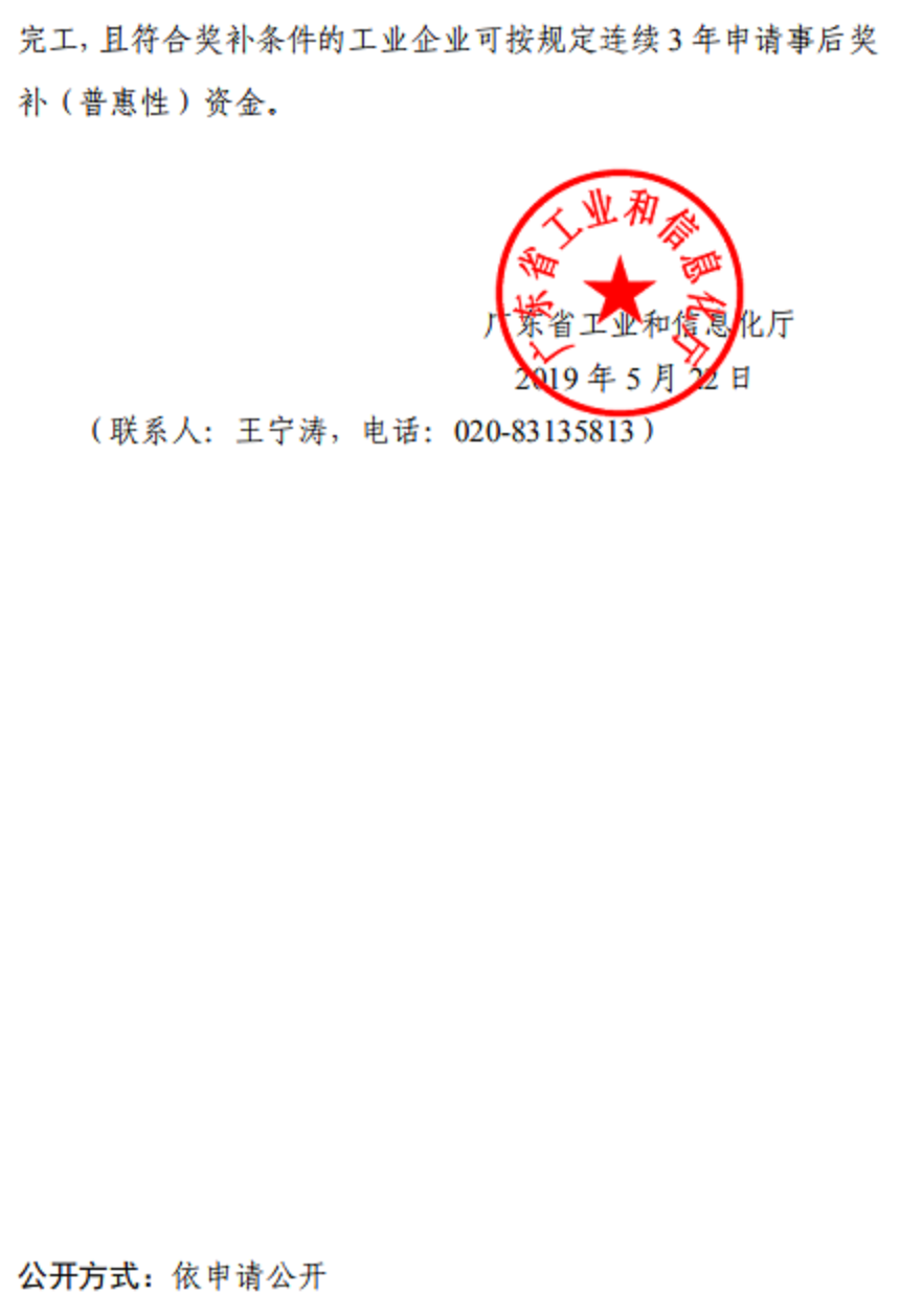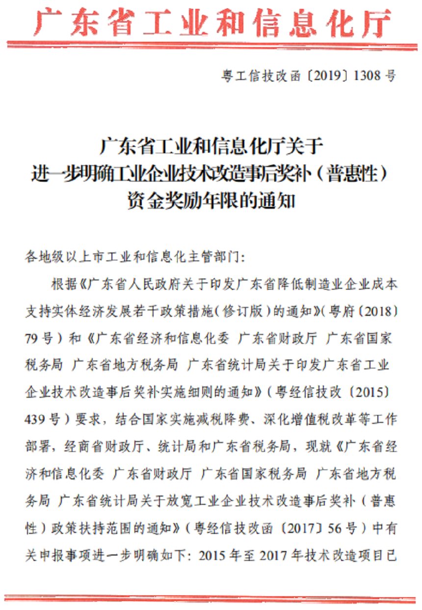粵工信技改函[2019]1308號(hào):廣東省工業(yè)和信息化廳關(guān)于進(jìn)一步明確工業(yè)企業(yè)技術(shù)改造事后獎(jiǎng)補(bǔ)(普惠性)資金獎(jiǎng)勵(lì)年限的通知.pdf